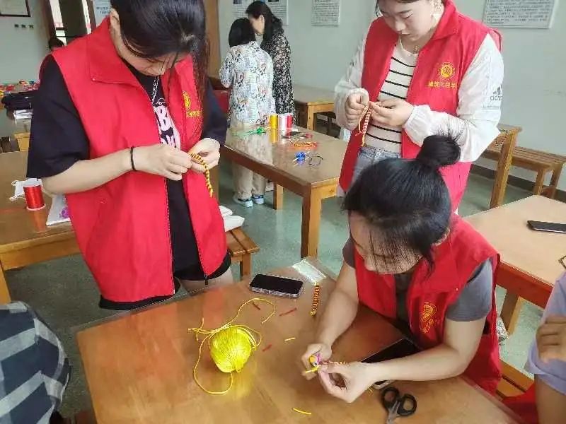 社会实践队的成员们跟随非遗艺人李媛媛老师的讲解,在烟台莱山文化馆学习了雀头结,千回结等结绳的编发。雀头结,用两线编织的绳结,雀头结在中国和西洋绳结里都有出现,纹理整齐美观,常寓意心情雀跃,喜上眉梢。一般用两线编织,技艺稍加变化,换用一卷细棉线用梭子编织,则成西洋古老的梭边蕾丝技法。